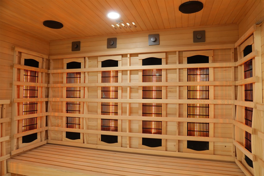 Štandardné žiariče z výroby: Infrasauna je osadená plnespektrálnymi žiaričmi RedGlass Dark . V druhom kroku objednávky je možné za zvýhodnenú cenu zvoliť alternatívu Philips Vitae .